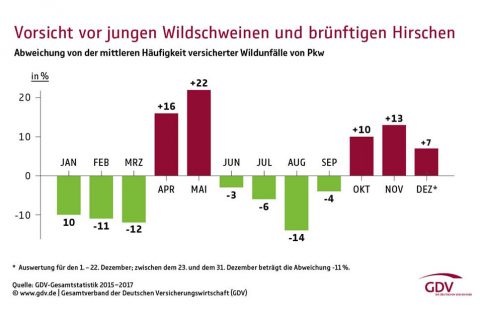 Nach Daten des Gesamtverbandes der Deutschen Versicherungswirtschaft (GDV) ist die Gefahr von Wildunfällen in den...