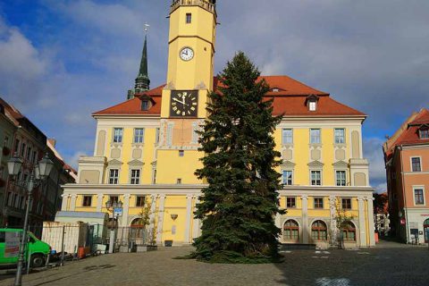 Eine 14 Meter hohe Blaufichte aus dem Garten der Bautzener Familie Birnbaum schmückt den Hauptmarkt....