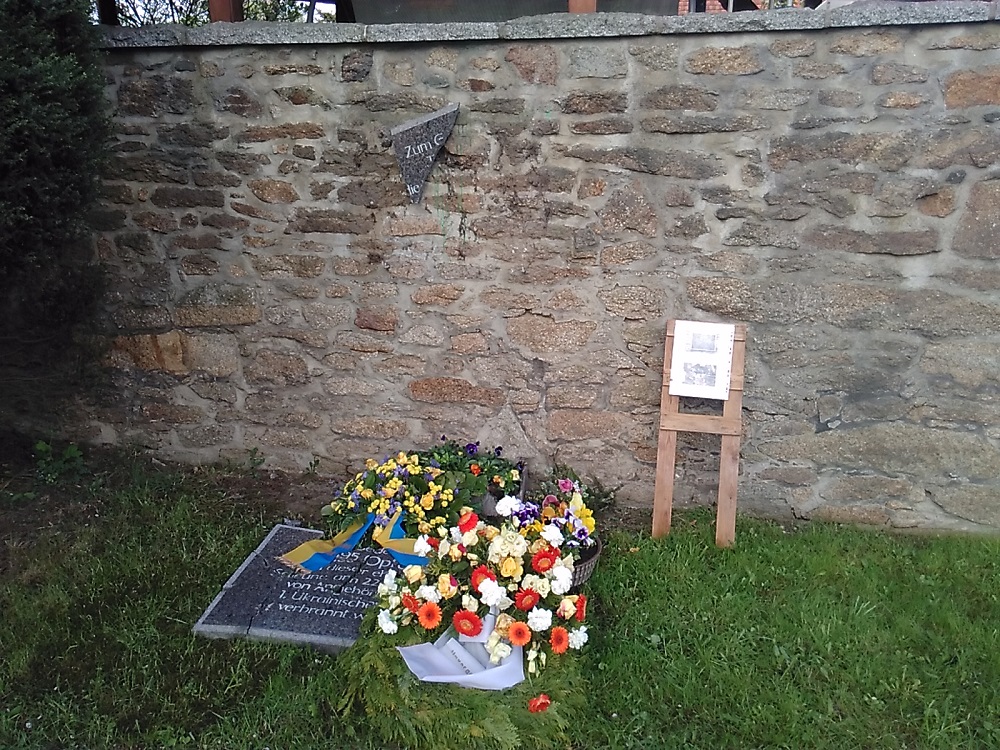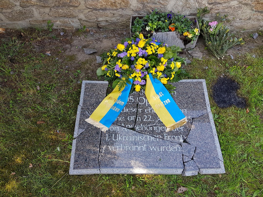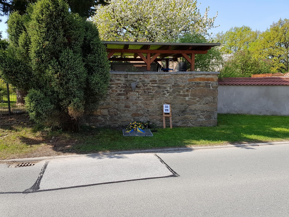 Info: Sowjetische Soldaten der 1. Ukrainischen Front hatten Ende April fast 200 Menschen in eine Scheune in Niederkaina getrieben und das Gebäude angezündet. Viele Menschen, auch Männer vom „Volkssturm“, verbrannten bei lebendigem Leib.
