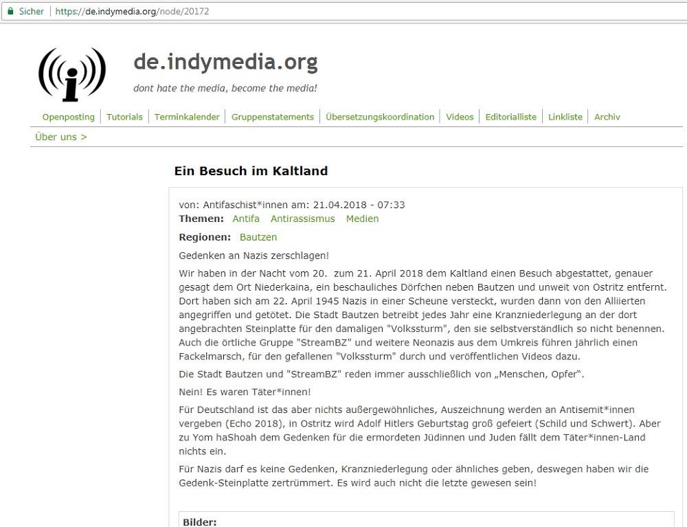 Nachdem Linksextreme bereits letzte Woche das Büro der AfD-Abgeordneten Karin Wilke in Dresden angegriffen haben und weitere militante Aktionen angekündigt hatten, wurde in der Nacht zum 21.April die Gedanktafel in Bautzen / OT Niederkaina zerstört. Während der MDR von unbekannten Tätern spricht, gibt es ein Bekennerschreiben auf indymedia.org.