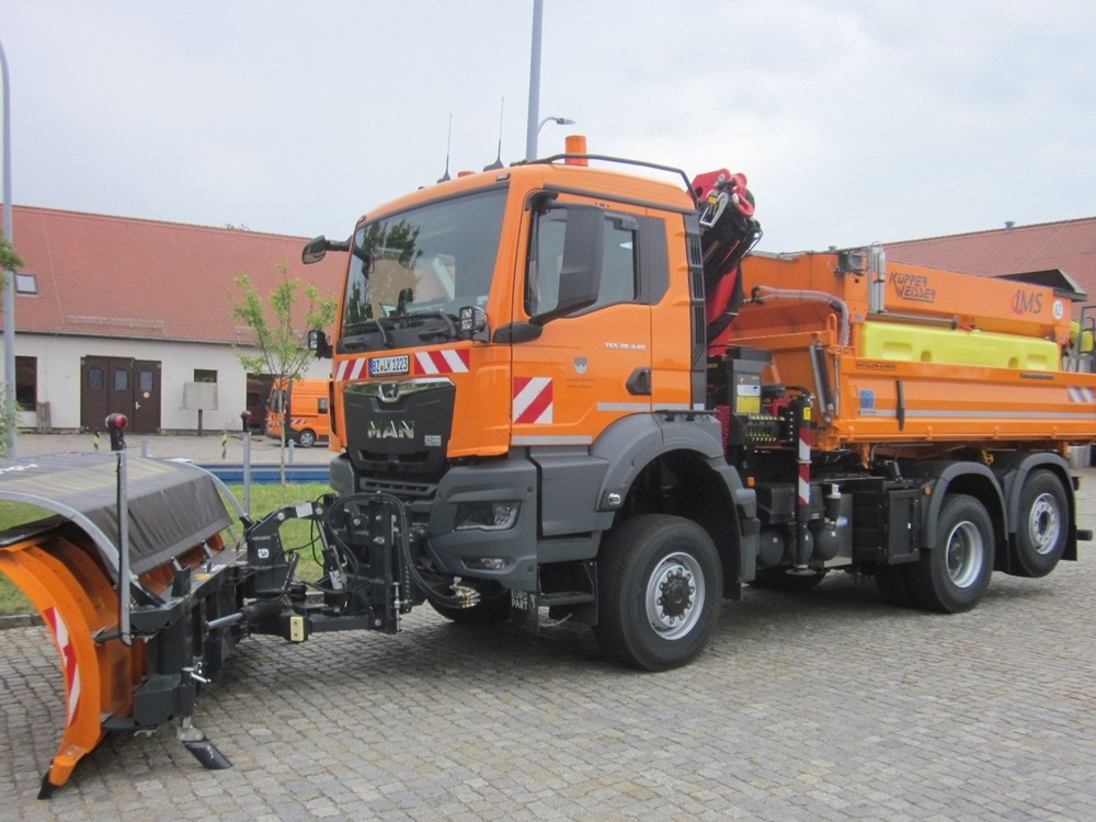 Die Fahrzeuge sind mit einer Streumaschine und einem Schneepflug ausgerüstet.